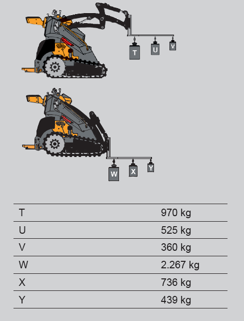 Kompatibilis munkaeszközök: Ásókar, Láncos árokásó (+szivattyú szükséges), Raklapvilla, Földkanál, Földkanál szorítófoggal, Terménykanál, Terménykanál szorítófoggal, Törmelékkanál, Törmelékkanál szorítófoggal, Pelikán kanál hegesztettfoggal, 4az1ben kanál, Trágyavilla szorítófoggal, Fix trágyatoló, V-trágyatolólap, Nyitható takarmány és trágyatolólap, Dönthető trágyatolólap, Bálatüske, Tisztító és tolókefe, Seprőgép, Minidömper, Viakolor fugázó kefe, Viakolor szállító, Kőrakó fogó, Zúzottkő villa, Zúzottkő villa szorítófoggal, Szintező, Front vonófej, Emelőkar, Szegély-gyomtakarító kefe, Mulcsozó (+szivattyú szükséges), Fűnyíró (+szivattyú szükséges), Hótolólap, Sószóró, Faág fogó, Farönk fogó (univerzális), Hidraulikus földfúró, Sövényvágó.